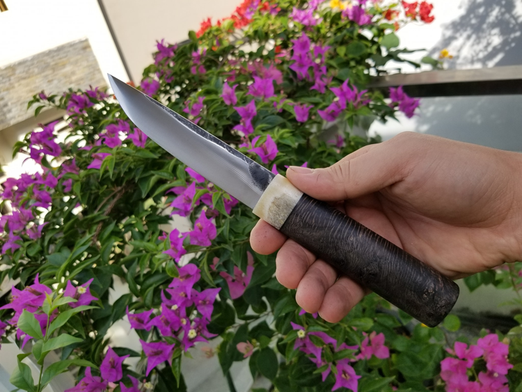 Lưỡi dao sau khi đã được hoàn thiện cán với sừng hưu và gỗ sồi (Oak) ổn định.