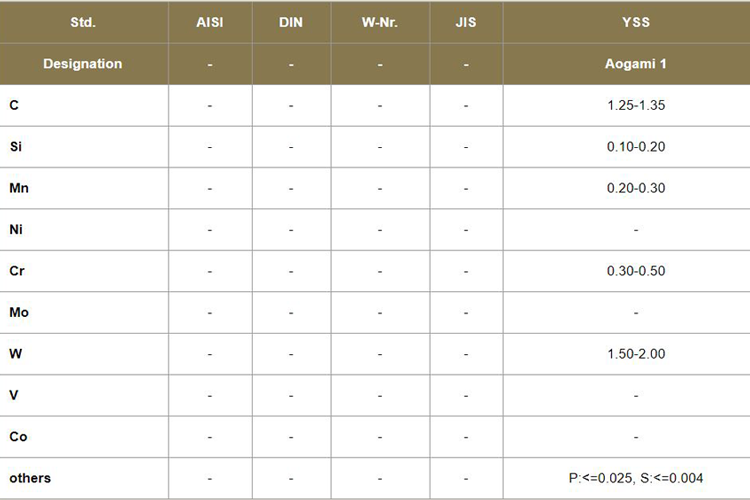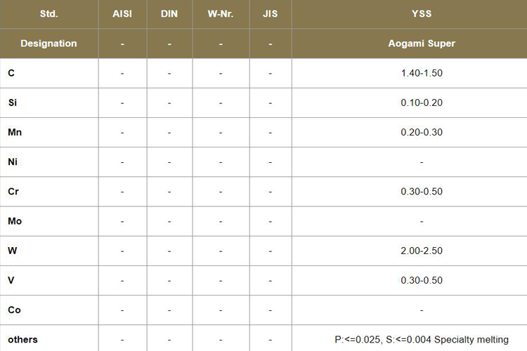 Thành phần hóa học thép Aogami Super. Theo Hitachi Metals
