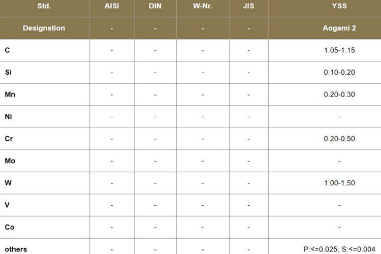 Thành phần hóa học thép Aogami No.2 (Giấy xanh số 2). Theo Hitachi Metals